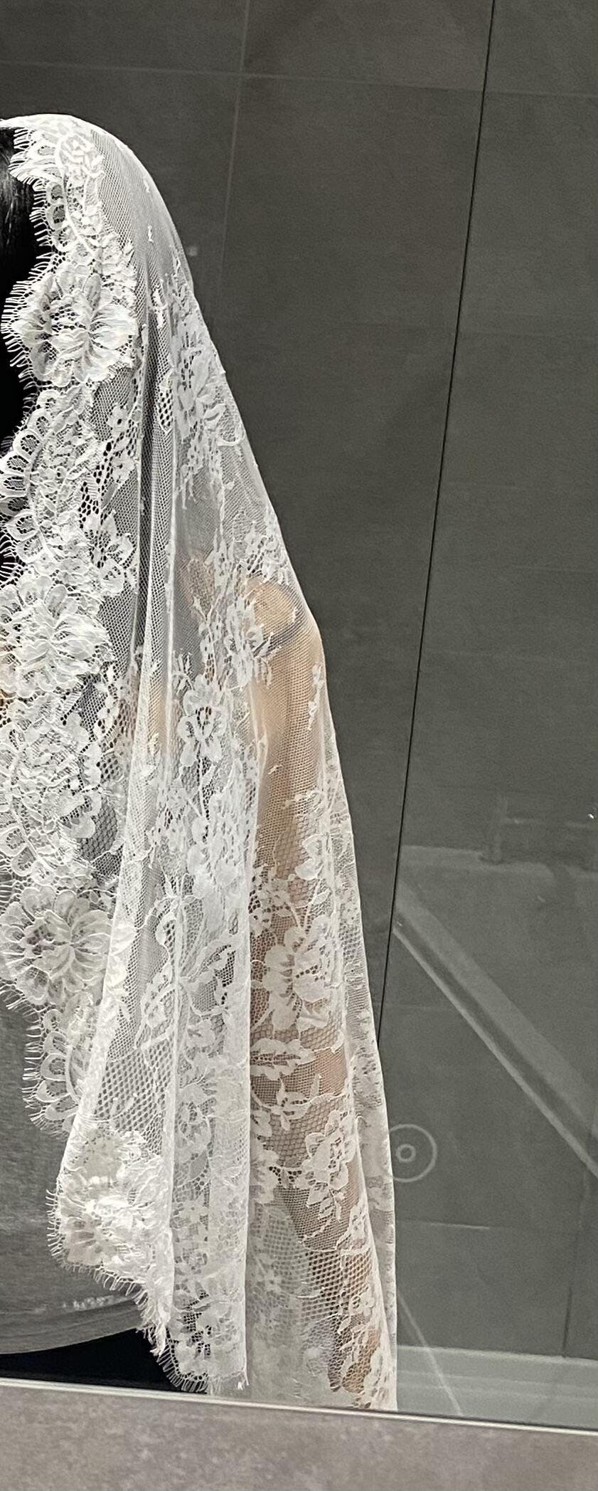 A vintage mantilla veil steeped in vintage elegance. Crafted from soft, airy tulle and edged in delicate all-over Chantilly lace, it frames the bride in feather-light texture and quiet luxury. The lace extends all around the veil for a truly timeless finish — soft, feminine, and unmistakably romantic.