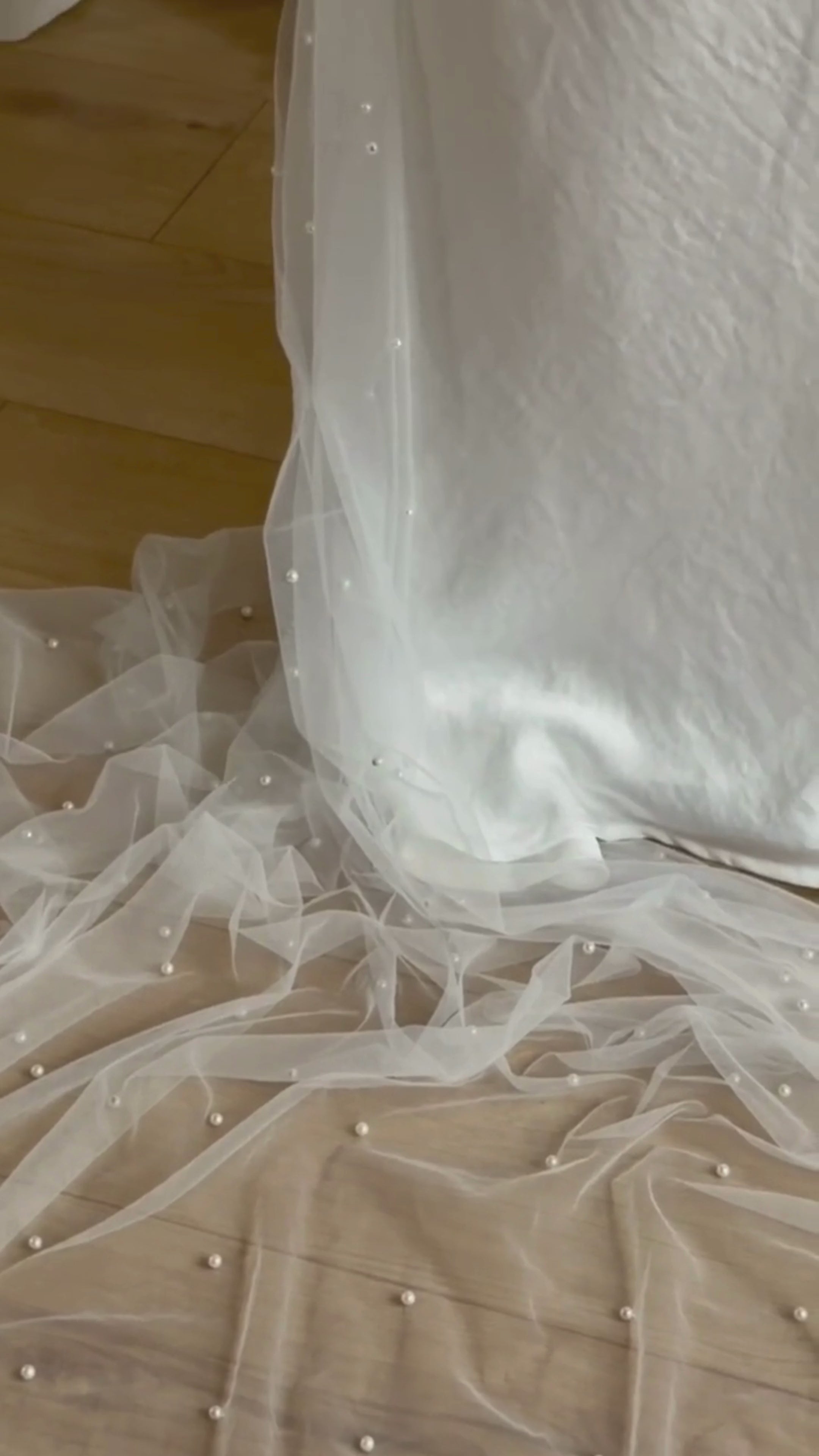 Our cathedral-length pearl wedding veil with drop-veil blusher is crafted for brides who adore timeless elegance but want a hint of contemporary glow. Dozens of pearls drift across soft tulle, giving the veil a luminous, dreamlike sheen that moves with you. The blusher adds a layer of intimacy — a quiet pause before the world sees you in full.